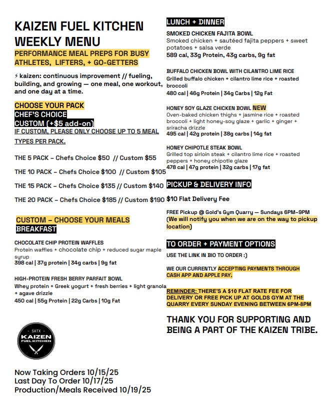 At Kaizen Fuel Kitchen, we don’t just make meals—we craft fuel. Every recipe is designed for athletes and busy professionals who demand more from their food: clean ingredients, high protein, and bold flavor that keeps up with your grind.Whether you’re chasing PRs in the gym, long days at work, or simply want healthier eating without the hassle, our meals are built to perform—just like you.Because great results don’t happen by chance. They’re fueled.